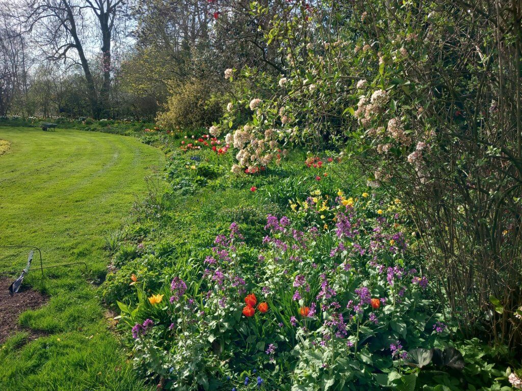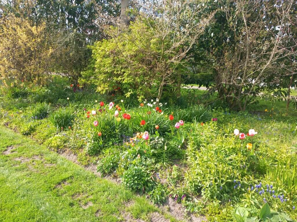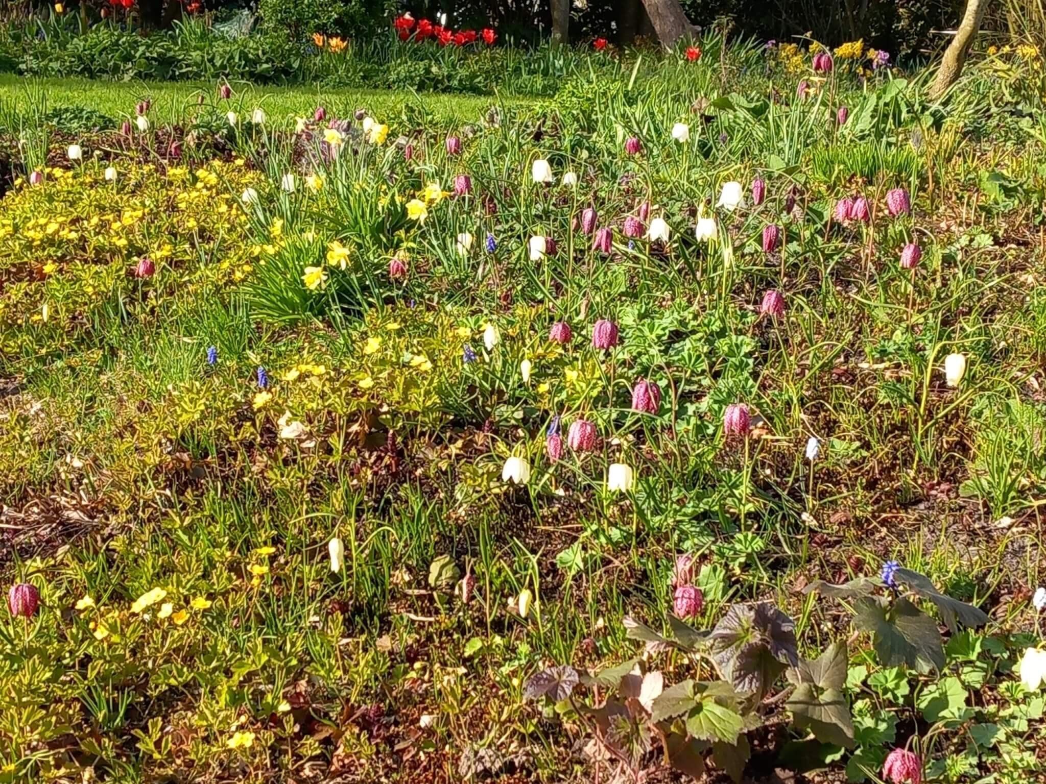 Op bovenstaande foto niet alleen tulpen (langs de bovenrand) maar vooral kievitsbloemen, ook in grote hoeveelheden dit voorjaar.