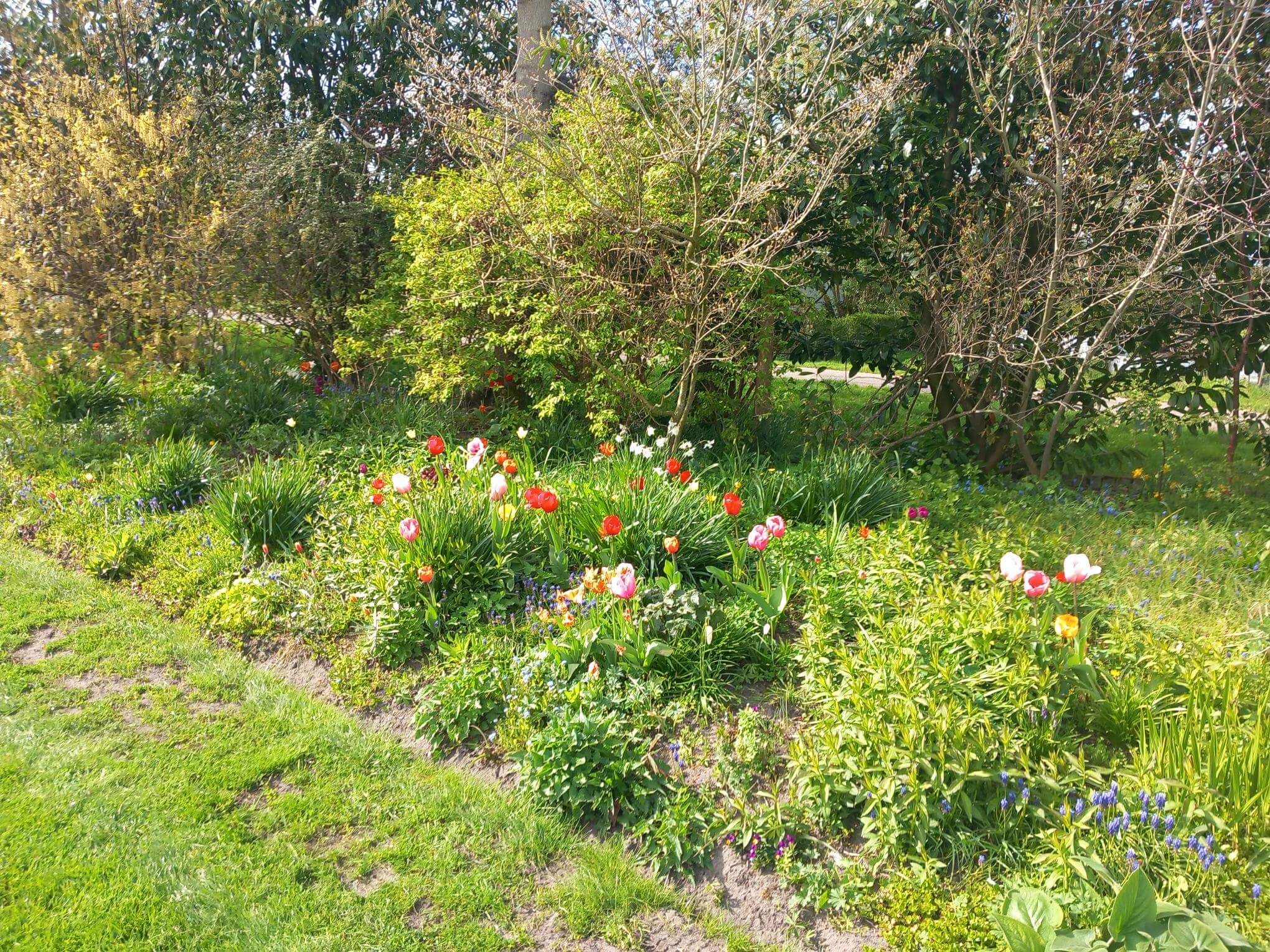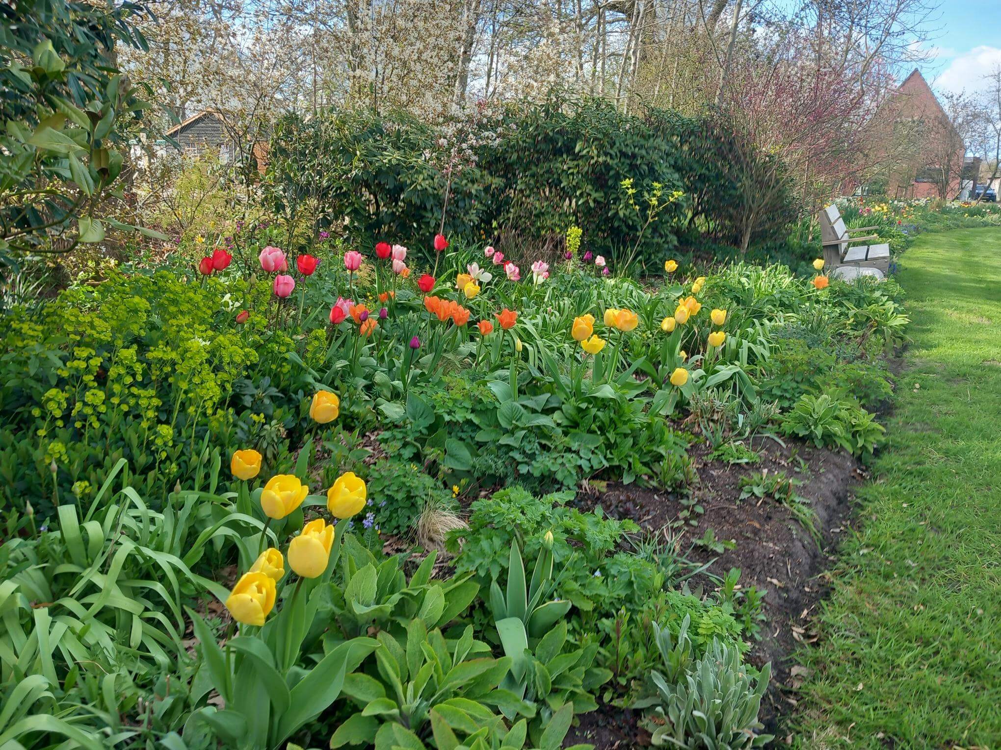 In de loop der jaren zijn er heel wat tulpenbollen de grond ingegaan. We hebben daar ook al aardig wat plezier van gehad. Toch bleven de resultaten wel eens achter bij de verwachtingen en sommige leken wel helemaal verdwenen. Dit voorjaar is dat allemaal anders. Al vroeg begonnen talloze tulpen hun kleurenkunsten te vertonen. En de ene soort leek een beetje het hoogtepunt gepasseerd en dan meldde zich al weer een volgende soort. Soms bloeiden er heel veel tegelijk, soms even wat minder. Het was, en is, een prachtige afwisseling en samenspel van kleuren geworden.