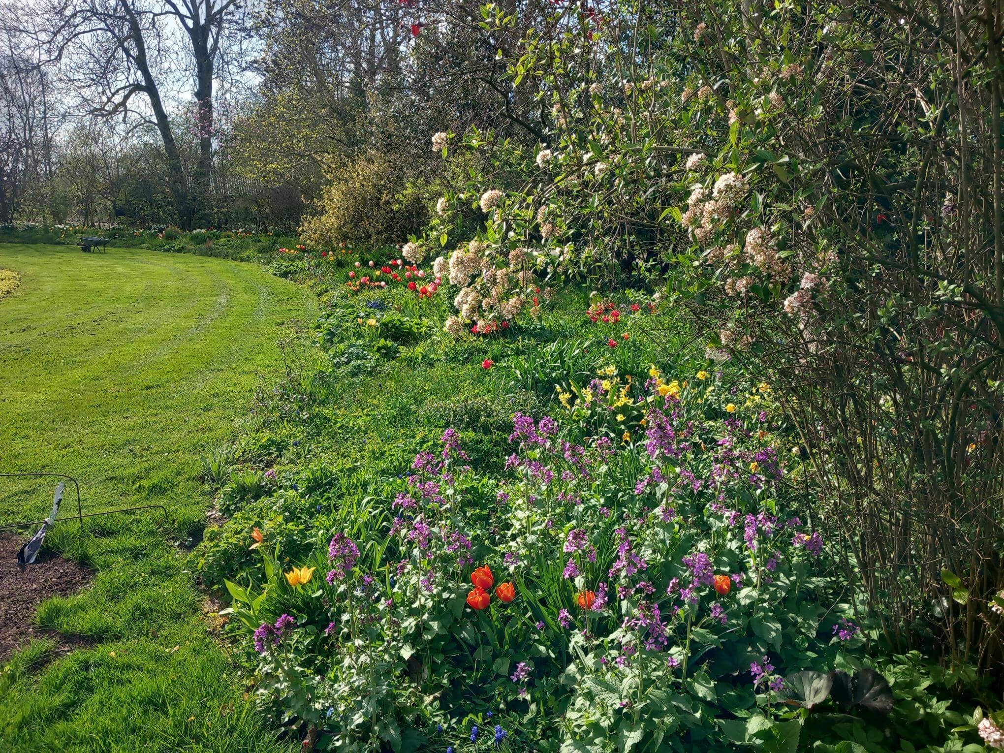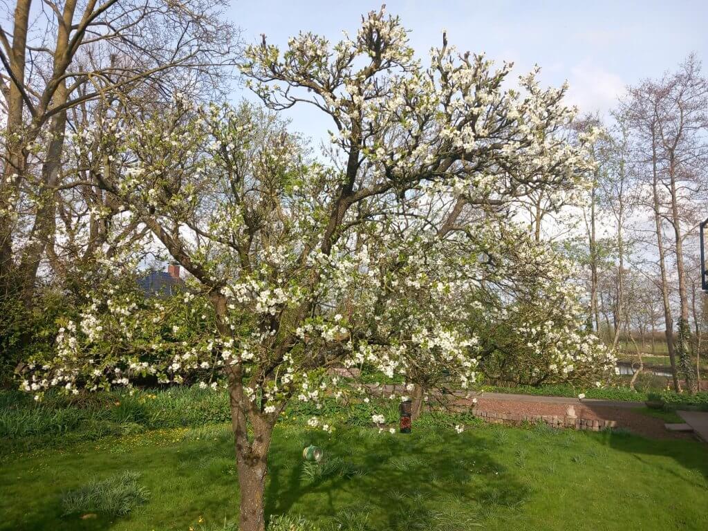 Naast tulpen zijn er meer mooie ontwikkelingen te bespeuren. De twee pruimenbomen, hier ongeveer in elkaars verlengde, bloeiden met zoveel witte bloesem dat we vol vertrouwen zijn in weer een mooi pruimenjaar.